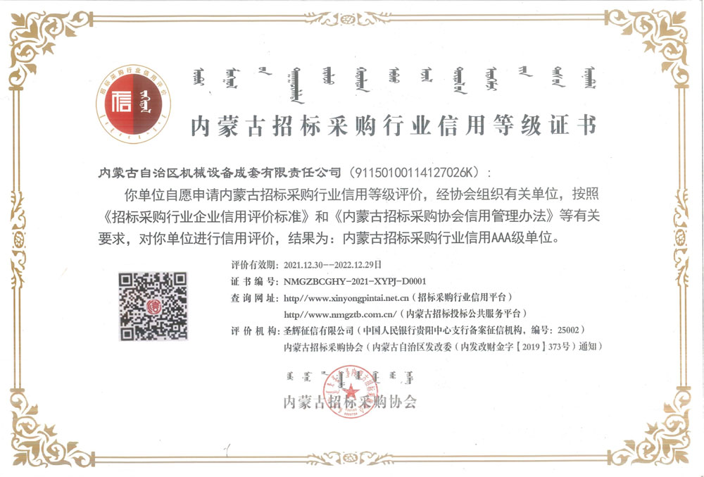 內(nèi)蒙古招標(biāo)采購行業(yè)信用AAA級單位資格證書